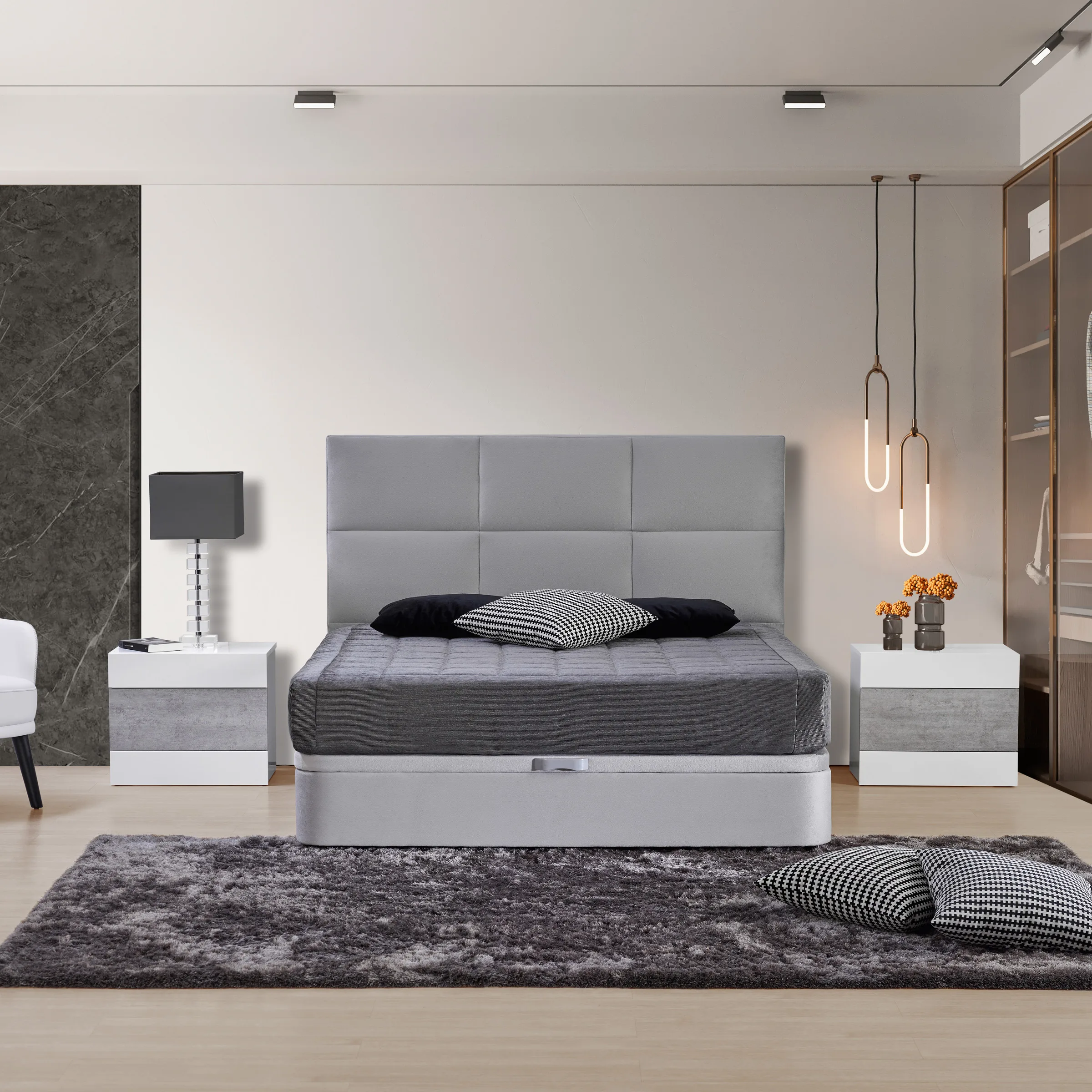 - Cabeceira estofada com gomos retangulares acolchoados, simétricos e perfeitos.