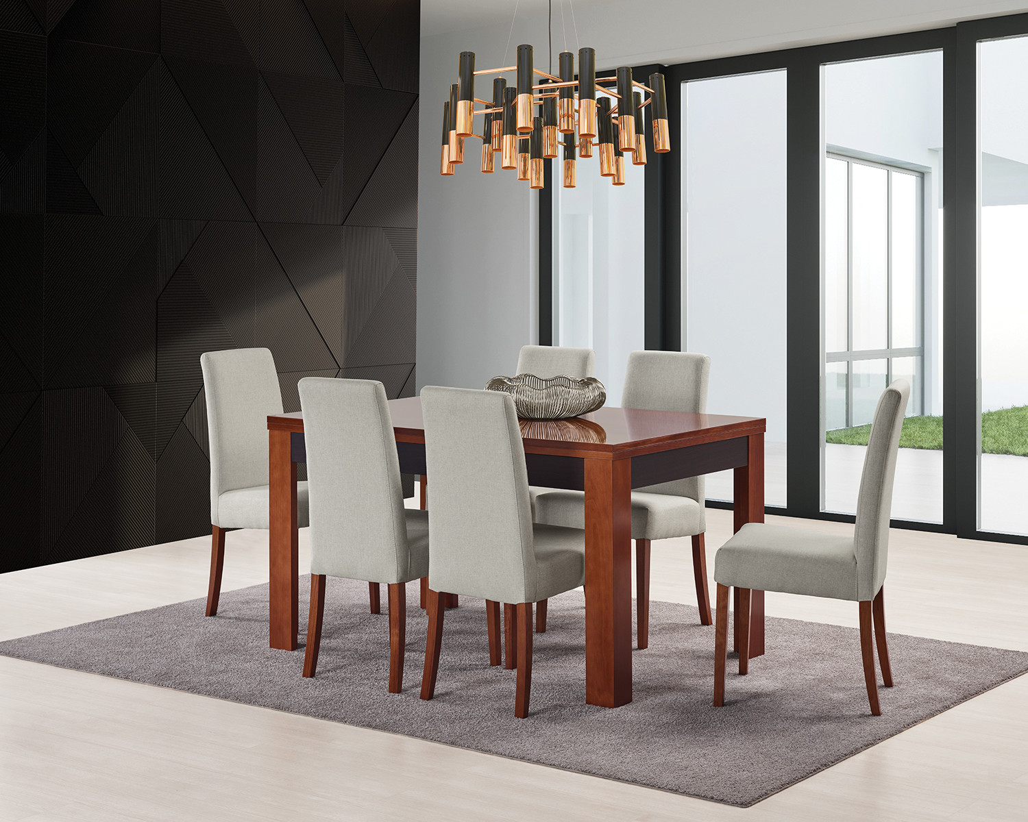 Cadeira para sala de jantar com assento e costas estofadas. Elegante, robusta e confortável, apresenta várias opções de tecido e acabamentos em madeira para as pernas.
