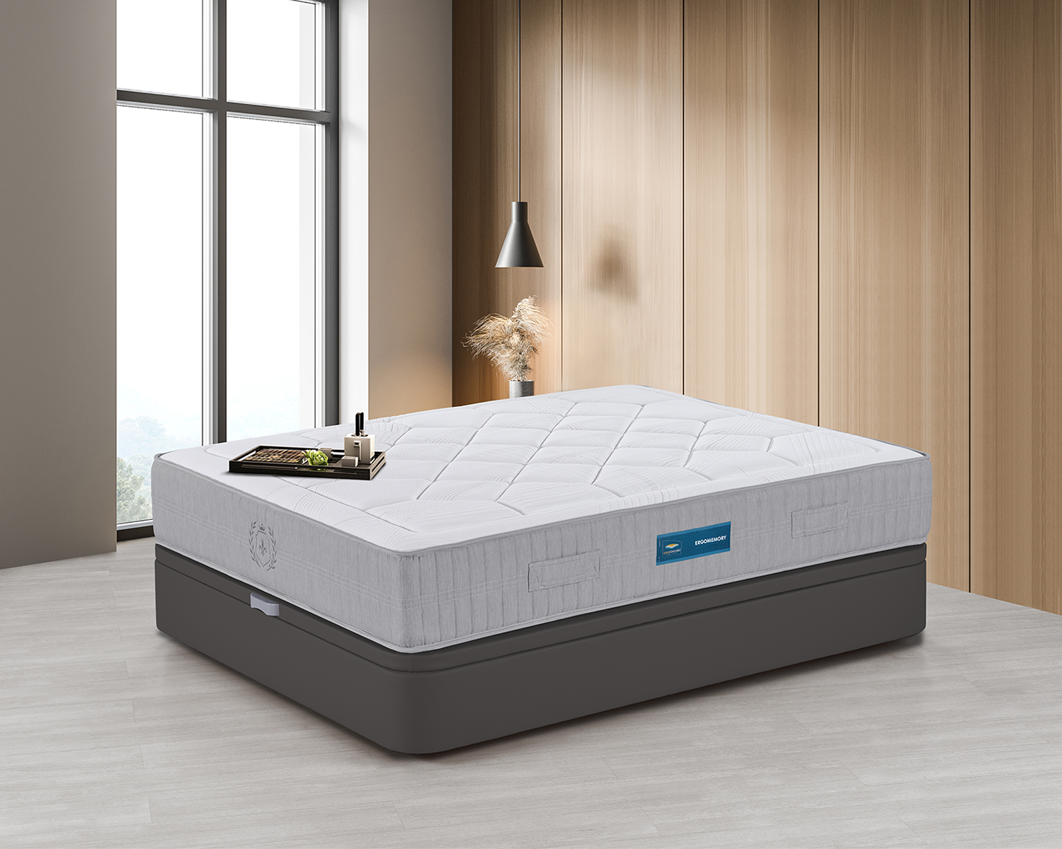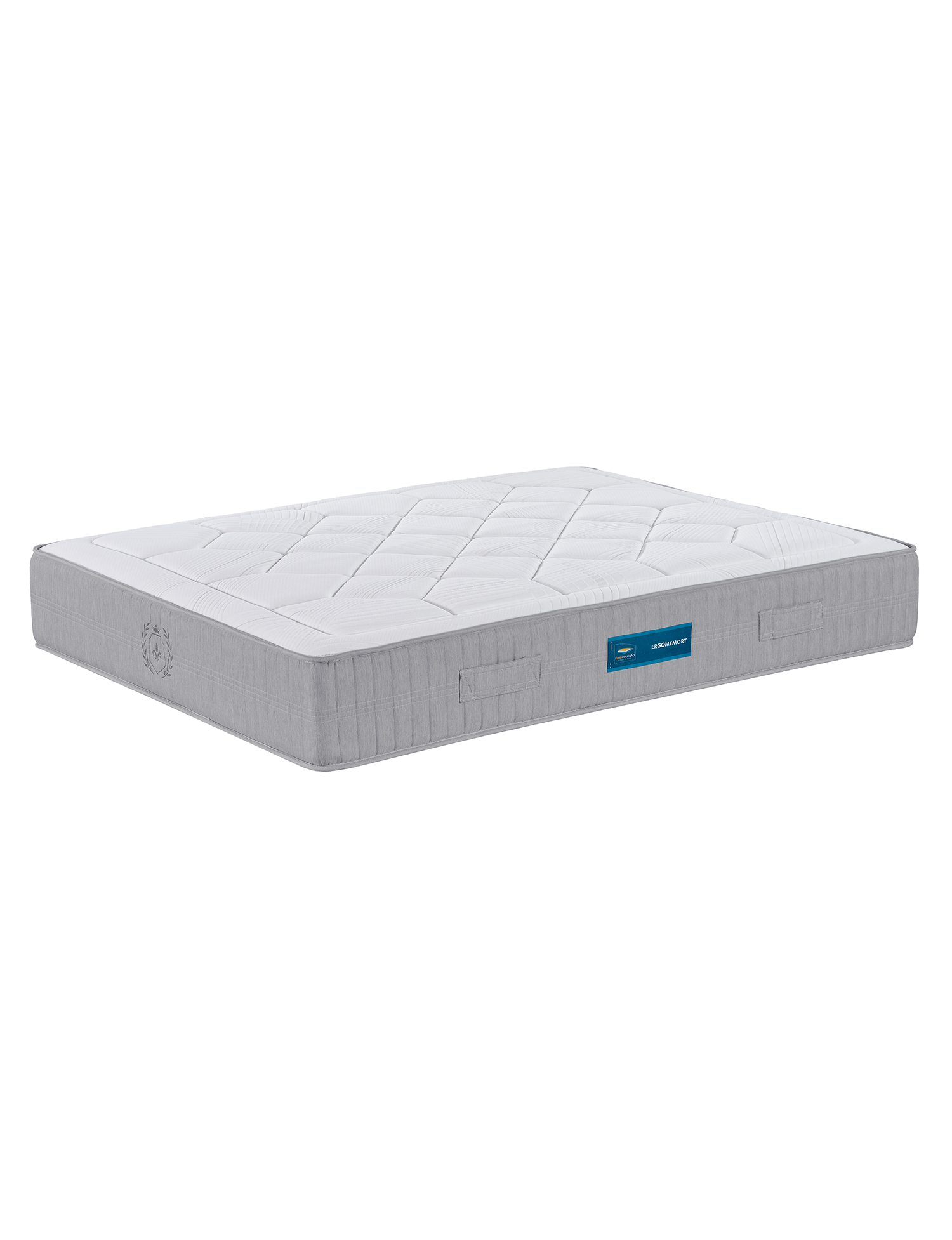 Colchão de molas ensacadas envolvidas em caixa de espuma para reforço da estabilidade, suporte e durabilidade.