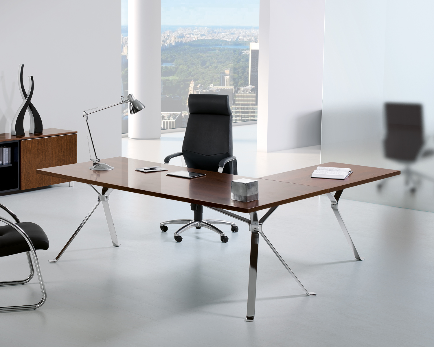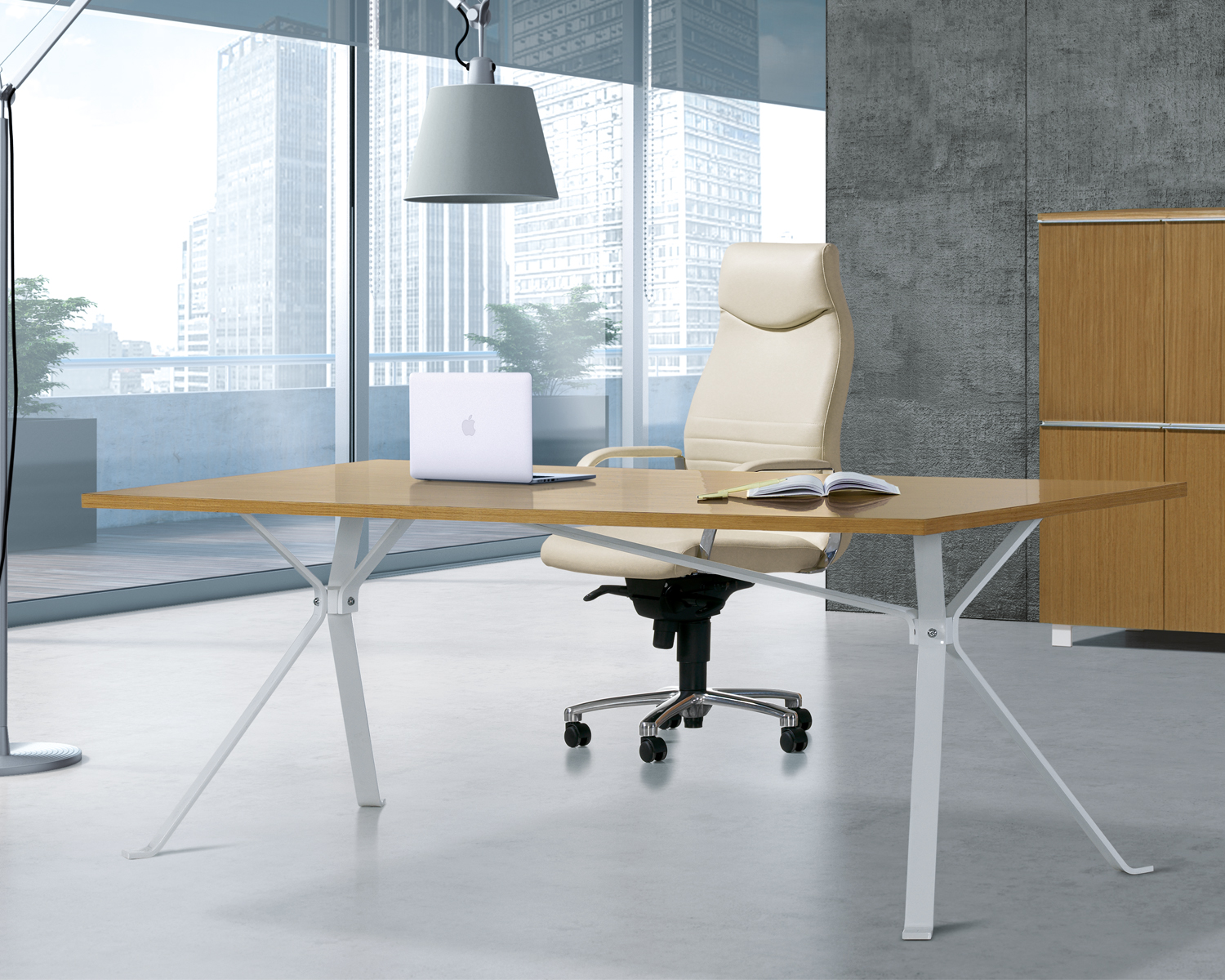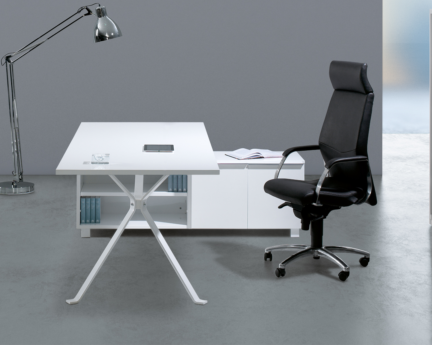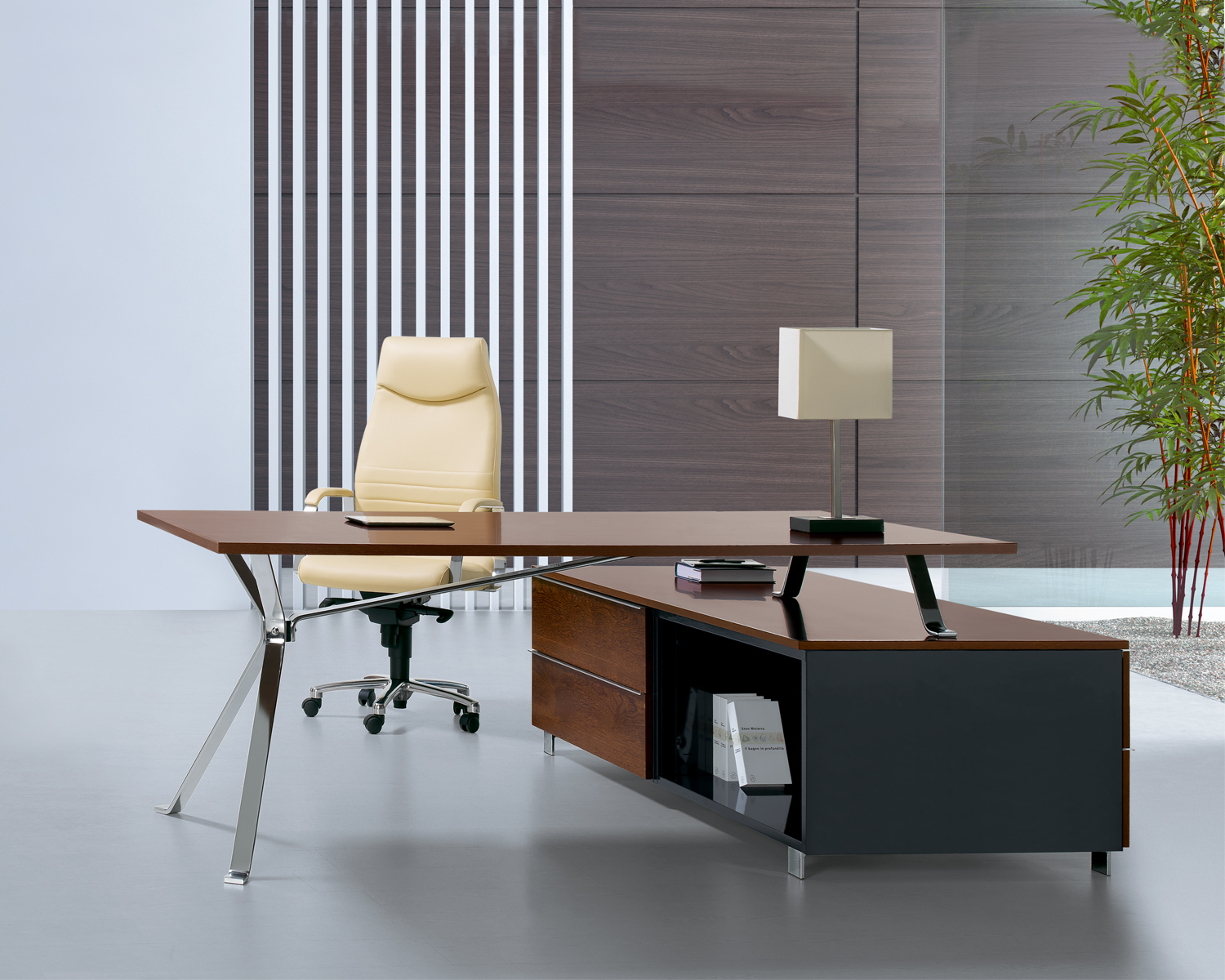 Uma secretária que não passa despercebida no escritório. O design das pernas confere-lhe originalidade e sofisticação, dando-lhe em simultâneo leveza e eficácia estrutural. Com inúmeras opções de acabamentos, tanto para a estrutura como para o tampo.