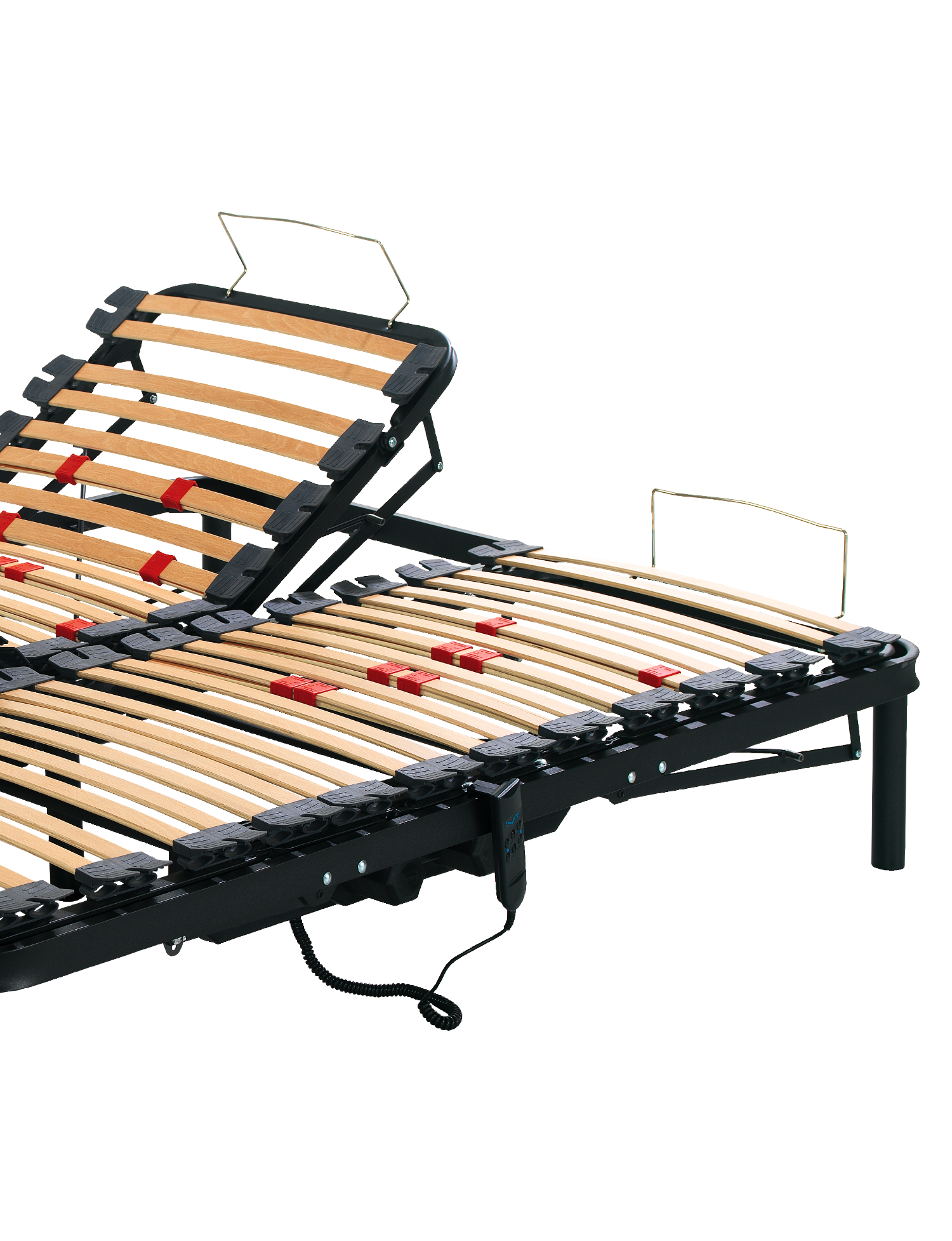 Cama articulada elétrica com estrado de réguas curvas de madeira, controlada através de comando manual e com motor.