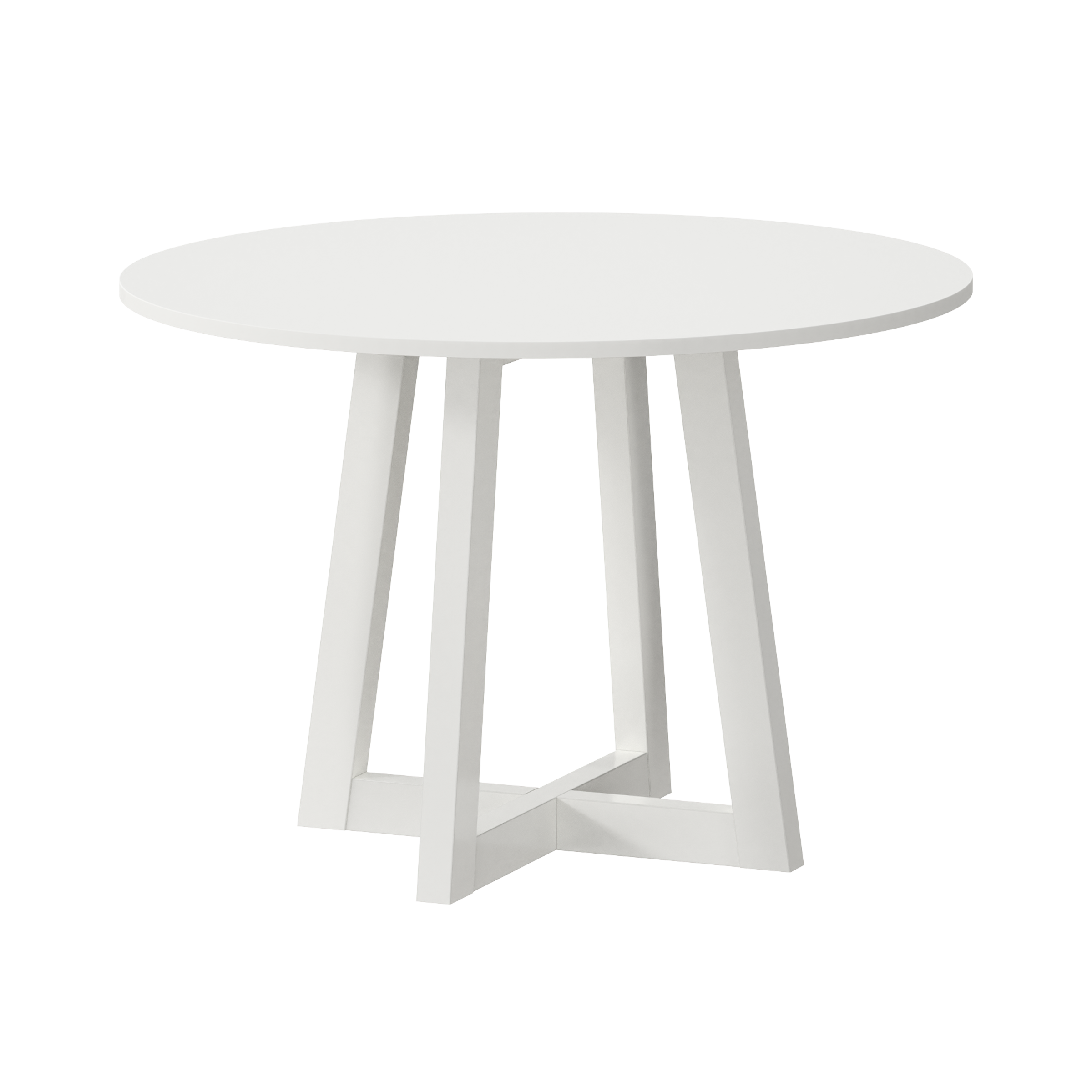- Mesa redonda, fixa, com 110 cm de diâmetro e originais pés cruzados, em madeira maciça.