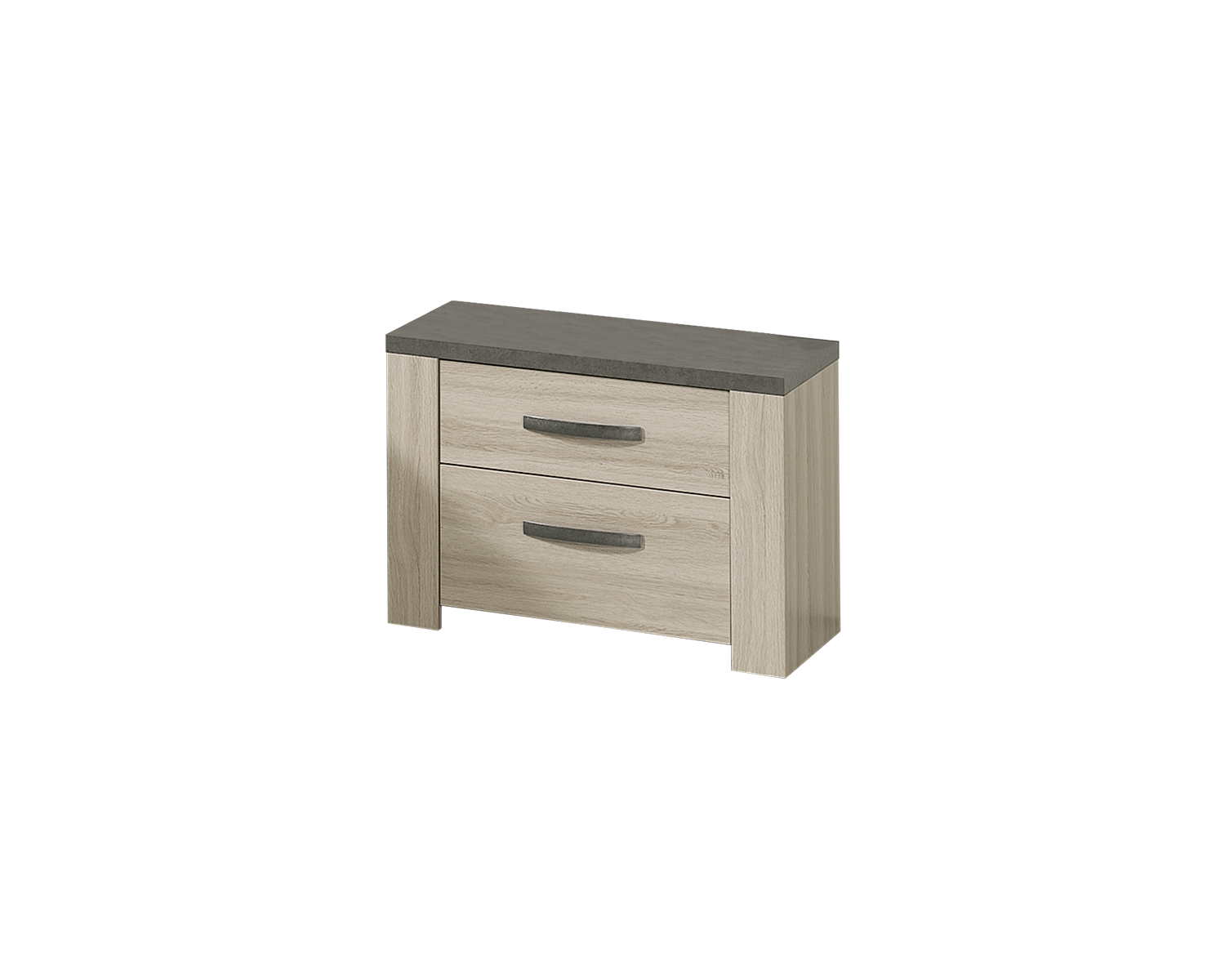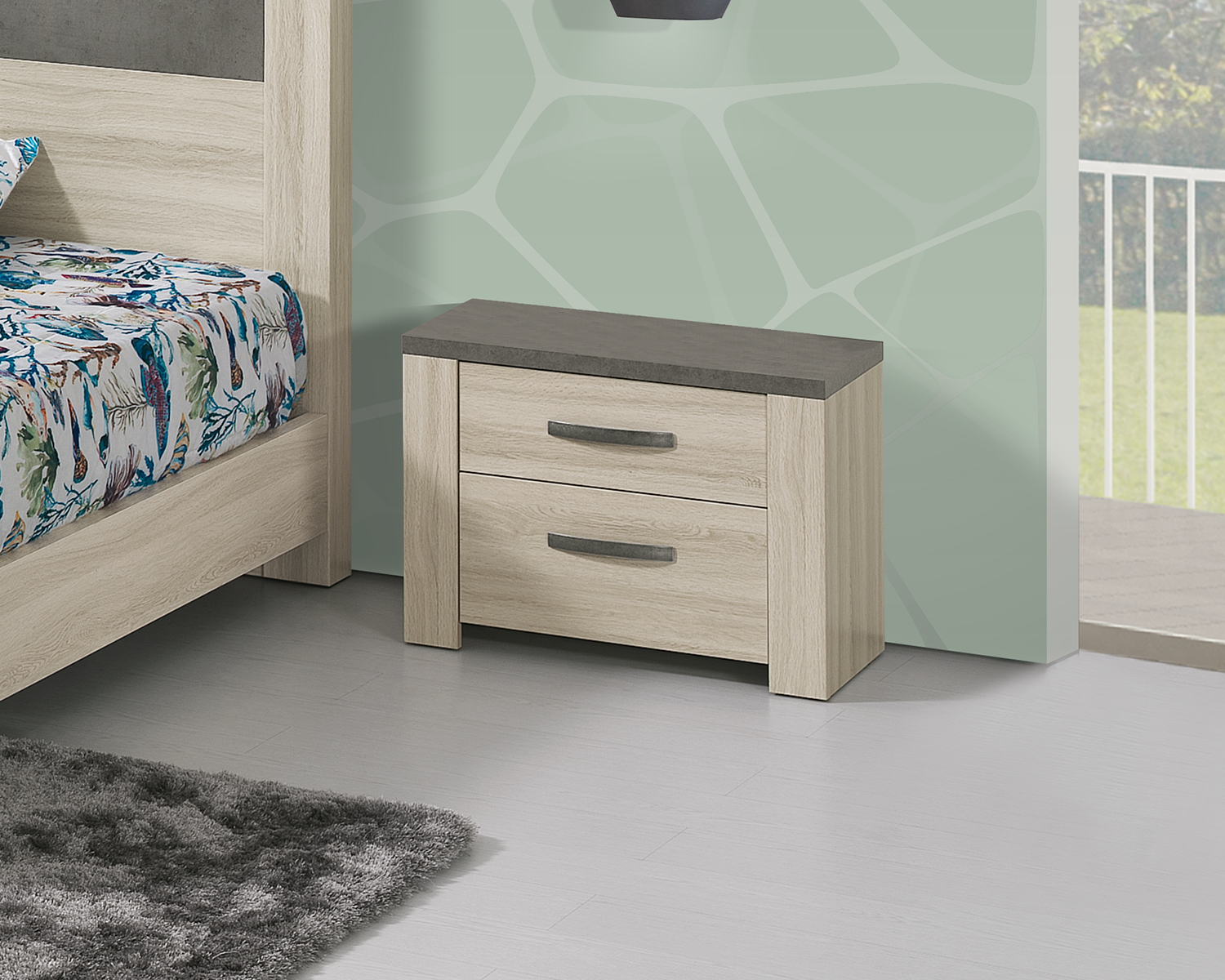 Mesa de cabeceira de linhas simples e direitas. Modelo exclusivo e eclético, combina a folha de carvalho com apontamentos de cinza. A opção perfeita para preencher o seu quarto de elegância. Com 2 gavetas para arrumação.