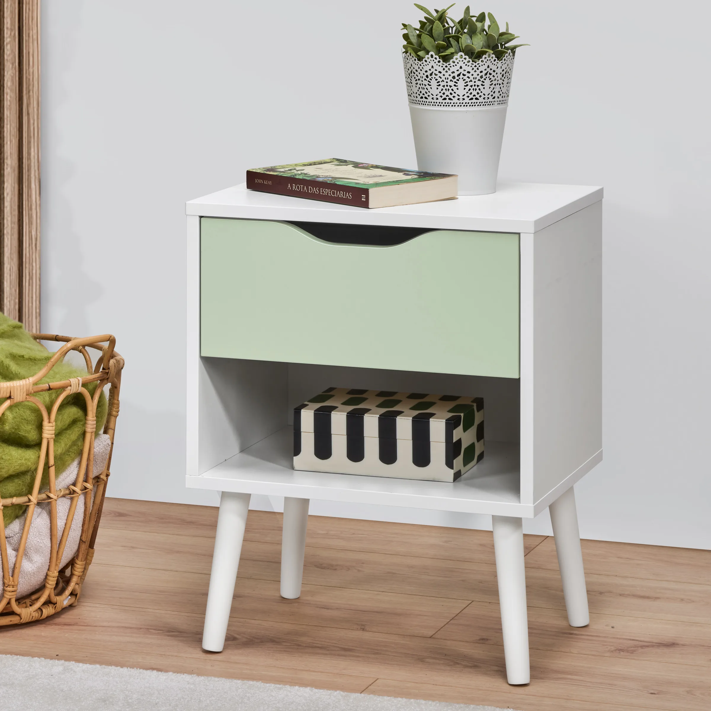 - Mesa de cabeceira com um original design de inspiração escandinava adaptado às tendências contemporâneas da decoração.