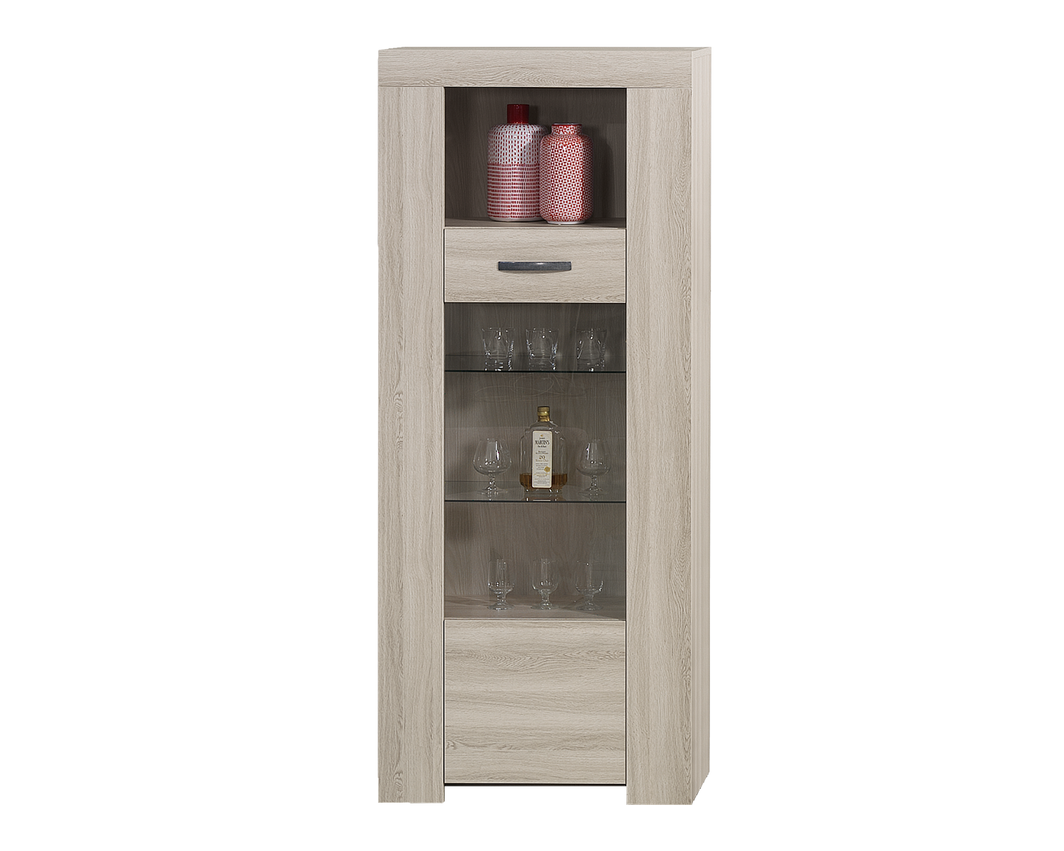 Modelo eclético, de linhas simples e direitas com apontamentos em vidro, como a porta e 2 prateleiras. Possui ainda um compartimento fechado, onde pode manter arrumadas as loiças que não quer exibir nas prateleiras de vidro.