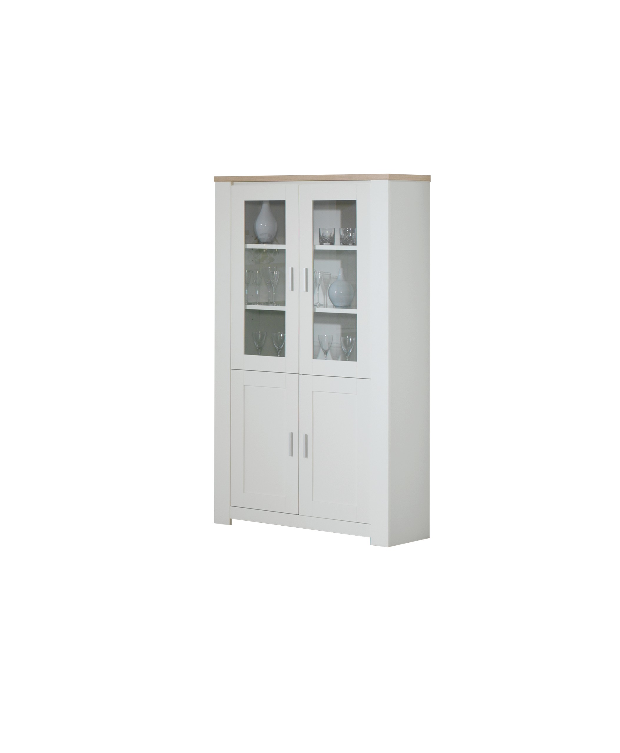 Cristaleira com linhas retas e contemporâneas para conseguir criar na sua sala de estar um ambiente elegante e depurado. A combinação do tom de carvalho com o branco confere-lhe um toque natural que alia o melhor estilo com a organização prática das suas loiças, taças e copos. Com duas portas de vidro e outras duas fechadas, permite-lhe exibir as suas peças preferidas, mantendo arrumadas as restantes.