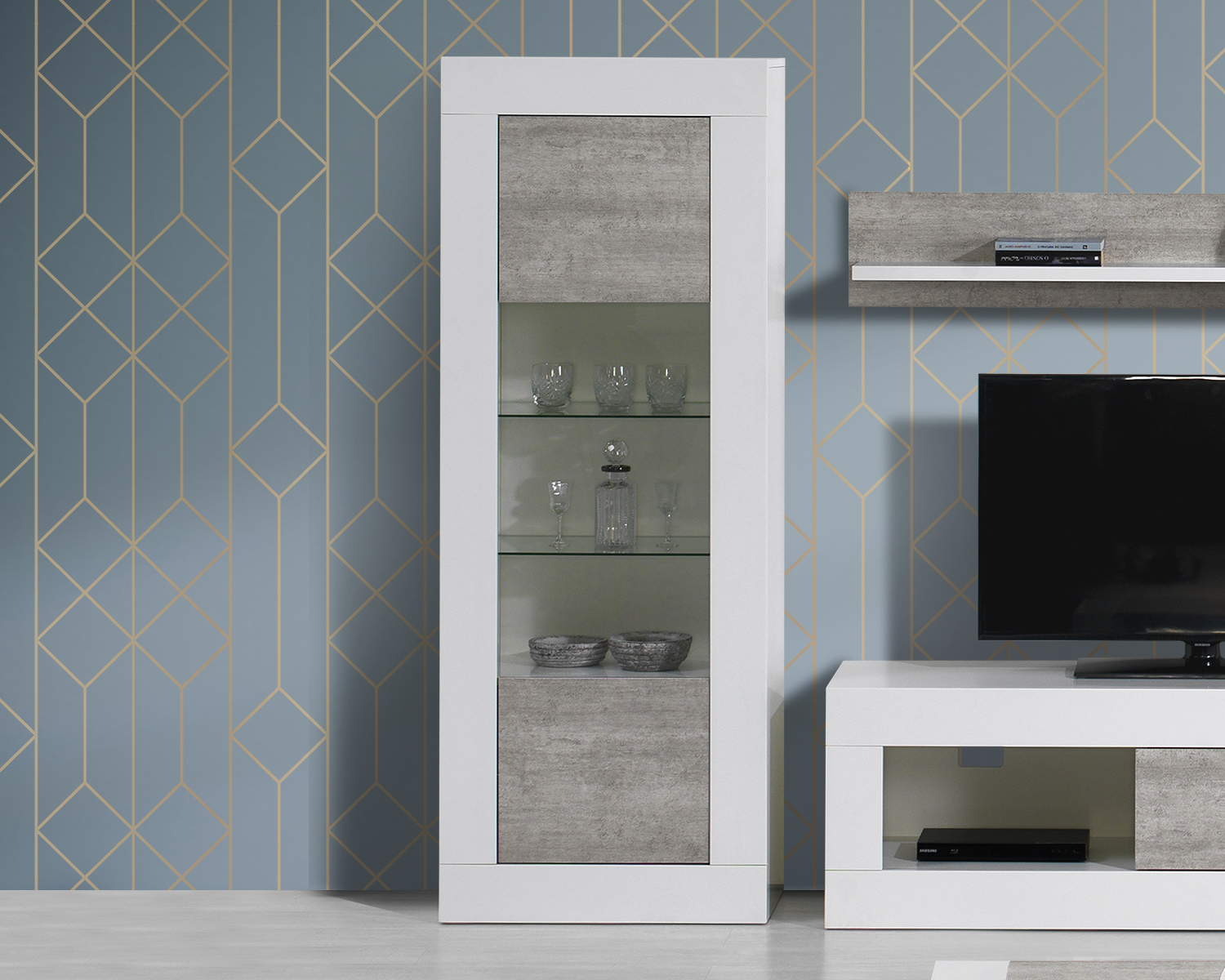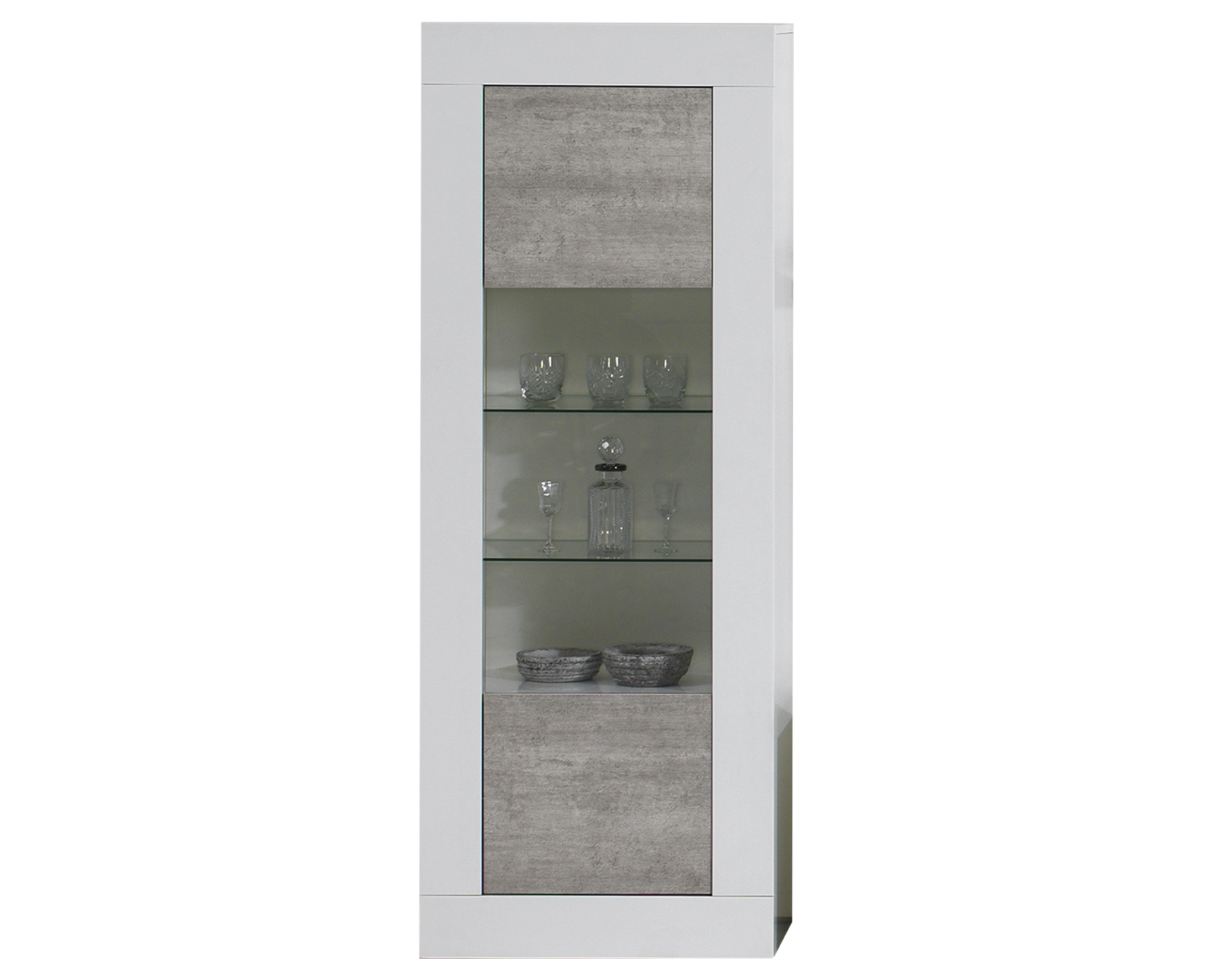 Cristaleira com linhas retas e contemporâneas para levar à sua sala um ambiente elegante e depurado. Em branco e cinza, combina o melhor estilo com a organização prática das suas loiças, taças e copos. Com duas prateleiras de vidro e dois compartimentos fechados, permite-lhe exibir as suas peças preferidas, mantendo arrumadas as restantes.