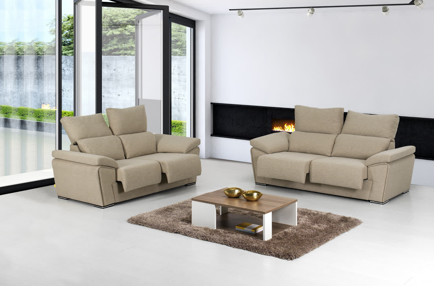Um sofá acolhedor que completa o look da sua sala. Com costas reclináveis e assentos deslizantes, é sinónimo de conforto e elegância. Revestimento em tecido. Com pés de plástico. Com tecido Kenya Khaki.